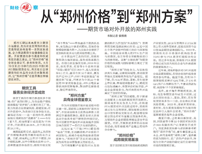 郑州长期以来高度关注期货市场建设,先后出台支持郑州商品交易所优势再造等一系列政策措施,全力推动期货市场健康稳定发展。开放便捷的参与通道和权威有效的意见表达,让“郑州价格”被全球业者认可、参考和使用。8月19日至20日举行的2025中国(郑州)国际期货论坛,再次吸引全球期货和衍生品行业的目光聚焦郑州,让“郑州价格”在世界舞台持续绽放光彩。(今日《郑州日报》6版)
