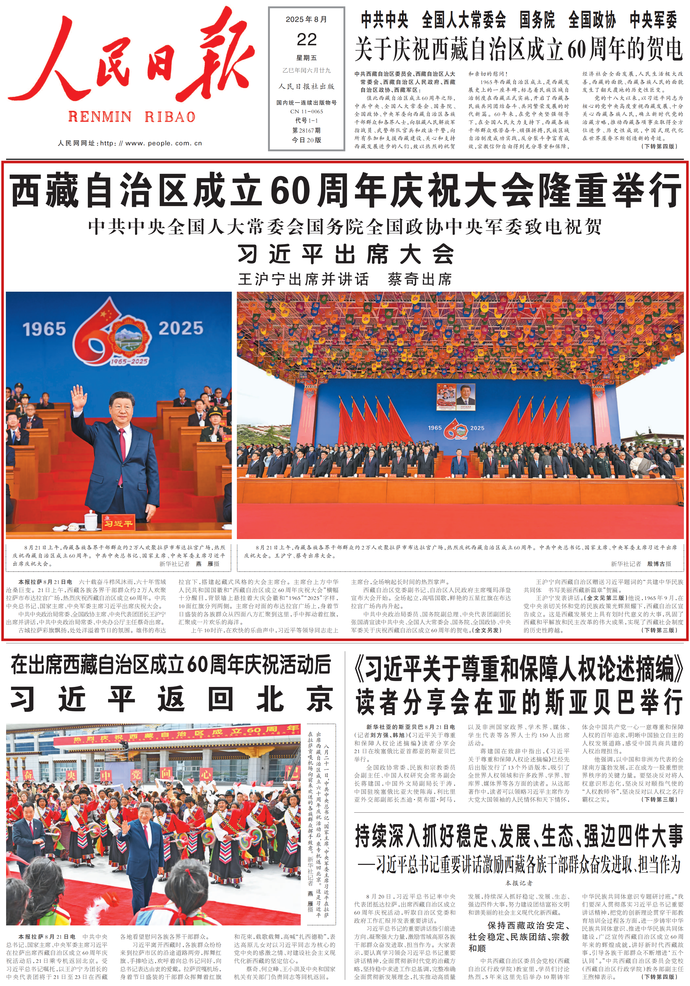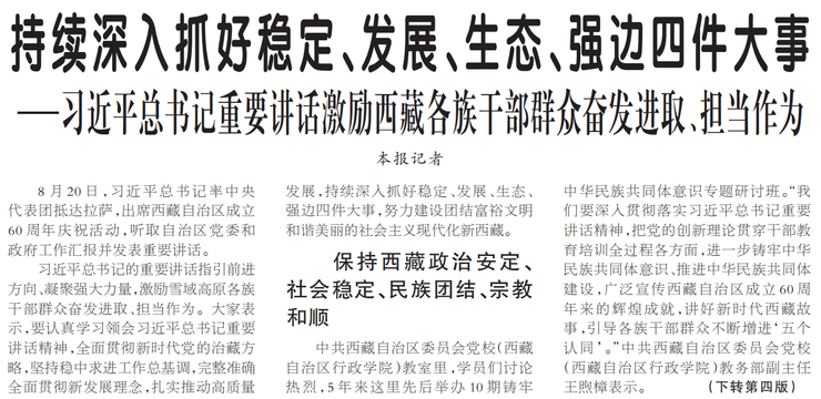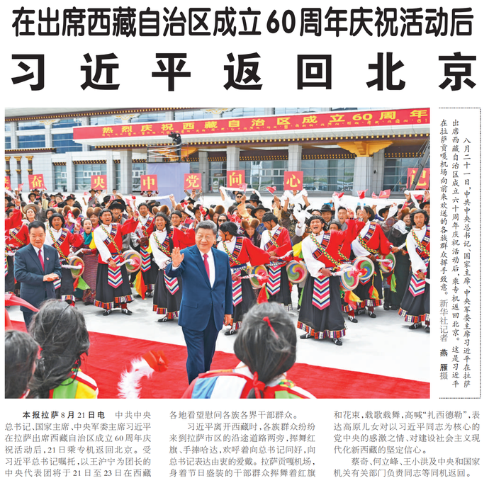 8月20日,习近平总书记率中央代表团抵达拉萨,出席西藏自治区成立60周年庆祝活动,听取自治区党委和政府工作汇报并发表重要讲话。(今日《人民日报》1版、4版)