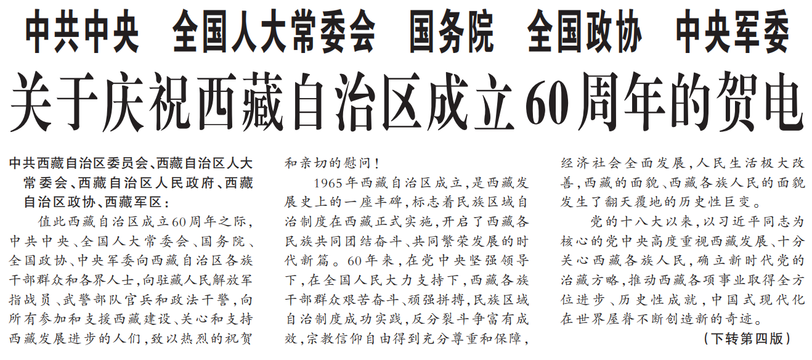 值此西藏自治区成立60周年之际,中共中央、全国人大常委会、国务院、全国政协、中央军委向西藏自治区各族干部群众和各界人士,向驻藏人民解放军指战员、武警部队官兵和政法干警,向所有参加和支援西藏建设、关心和支持西藏发展进步的人们,致以热烈的祝贺和亲切的慰问!(今日《人民日报》1版、4版)