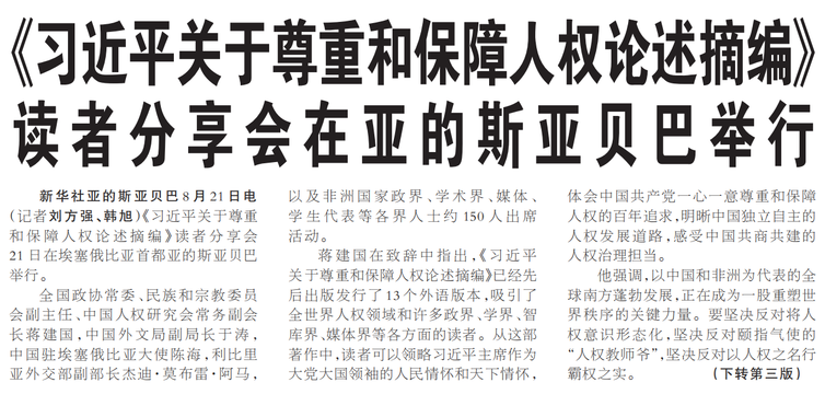 《习近平关于尊重和保障人权论述摘编》读者分享会21日在埃塞俄比亚首都亚的斯亚贝巴举行。(今日《人民日报》1版、3版)