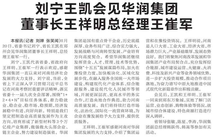 8月20日,省委书记刘宁、省长王凯在郑州会见华润集团董事长王祥明、总经理王崔军一行。(今日《河南日报》1版)