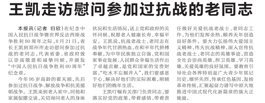 在纪念中国人民抗日战争暨世界反法西斯战争胜利80周年之际,8月21日,省长王凯到郑州市走访慰问参加过抗战的老同志,代表省委、省政府致以崇高敬意和诚挚问候,并颁发“中国人民抗日战争胜利80周年”纪念章。(今日《河南日报》1版)