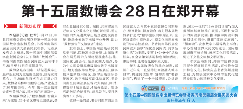 8月21日,省委宣传部在郑召开第十五届中国国际数字出版博览会、书香河南第四届全民阅读大会新闻发布会。记者从会上获悉,由中国新闻出版研究院主办的第十五届中国国际数字出版博览会,即将于8月28日至31日在郑州召开,这是中国国际数字出版博览会首次落地河南郑州。书香河南第四届全民阅读大会也将与本届数博会同期同地举办。(今日《郑州日报》2版)