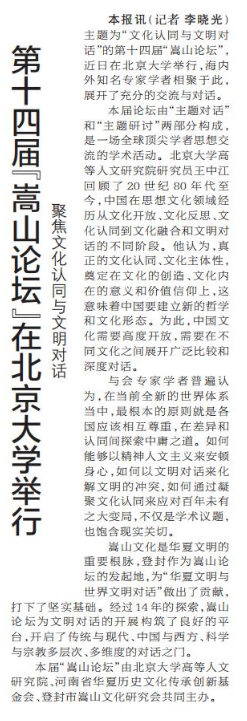 主题为“文化认同与文明对话”的第十四届“嵩山论坛”,近日在北京大学举行,海内外知名专家学者相聚于此,展开了充分的交流与对话。(今日《郑州日报》1版)