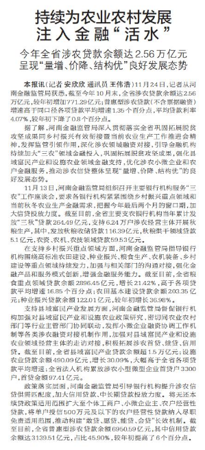 11月24日,记者从河南金融监管局获悉,截至今年10月末,全省涉农贷款余额达2.56万亿元,较年初增加771.29亿元;普惠型涉农贷款(不含票据融资)增速高于同口径各项贷款平均增速1.35个百分点,平均贷款利率4.07%,较年初下降了0.8个百分点。(今日《郑州日报》1版)