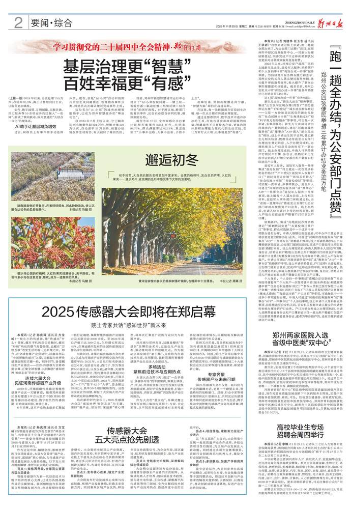 一枚小小的传感器,能“传感出”什么?答案,藏在手机的指尖轻触间,藏在“秒级”响应的燃气报警器里,也藏在“万物互联”改变生活的每一处肌理之中。如今,在全球智能产业竞逐中,河南郑州以“中国智能传感谷”之姿,正崛起为世界传感器版图的关键一极。初冬时节,备受瞩目的产业盛会——2025传感器大会将再度启幕,汇聚全球智慧,共同解答“感知世界 智创未来”的宏大命题。(今日《郑州日报》2版)