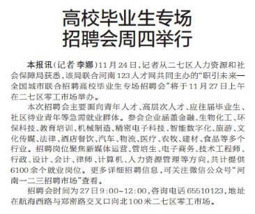 11月24日,记者从二七区人力资源和社会保障局获悉,该局联合河南123人才网共同主办的“职引未来—全国城市联合招聘高校毕业生专场招聘会”将于11月27日上午在二七区零工市场举办。(今日《郑州日报》2版)