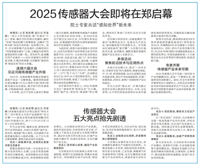 当智能传感成为万物互联的“神经末梢”,当中原沃土化身产业创新的“动力引擎”——备受全球传感器领域瞩目的2025传感器大会,将于11月29日至12月1日在郑州举行。(今日《郑州日报》2版)