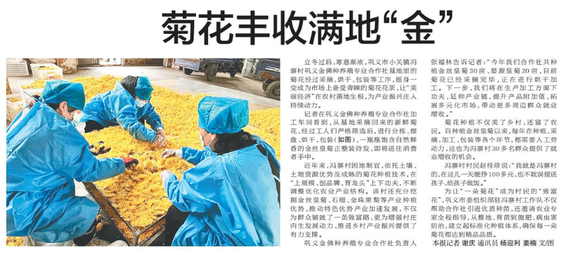 立冬过后,寒意渐浓,巩义市小关镇冯寨村巩义金佛种养殖专业合作社基地里的菊花经过采摘、烘干、包装等工序,摇身一变成为市场上备受青睐的菊花花茶,让“美丽经济”在农村落地生根,为产业振兴注入持续动力。(今日《郑州日报》7版)