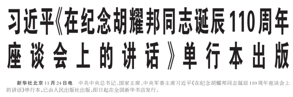 中共中央总书记、国家主席、中央军委主席习近平《在纪念胡耀邦同志诞辰110周年座谈会上的讲话》单行本,已由人民出版社出版,即日起在全国新华书店发行。(今日《人民日报》1版)