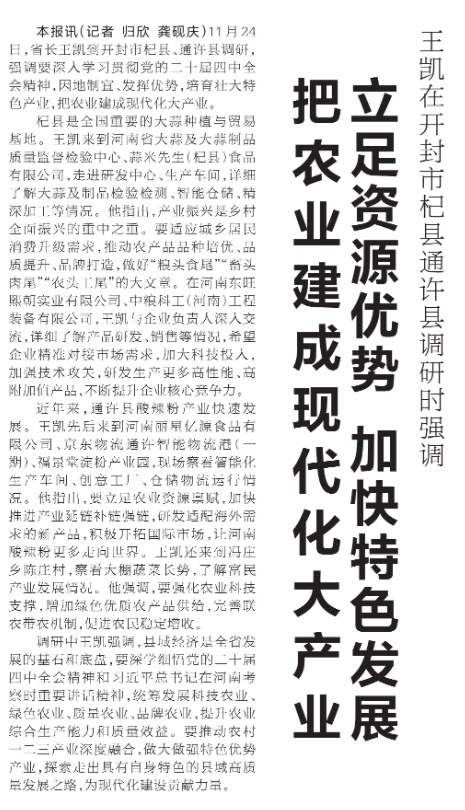 11月24日,省长王凯到开封市杞县、通许县调研,强调要深入学习贯彻党的二十届四中全会精神,因地制宜、发挥优势,培育壮大特色产业,把农业建成现代化大产业。(今日《河南日报》1版)