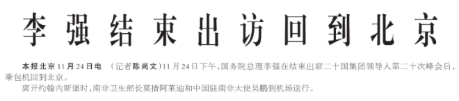 11月24日下午,国务院总理李强在结束出席二十国集团领导人第二十次峰会后,乘包机回到北京。(今日《人民日报》1版)