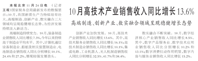10月高技术产业销售收入同比增长13.6%