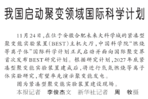 我国启动聚变领域国际科学计划