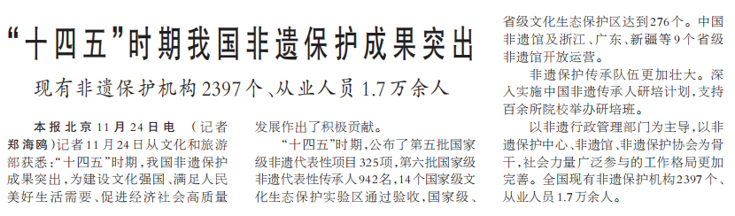 记者11月24日从文化和旅游部获悉:“十四五”时期,我国非遗保护成果突出,为建设文化强国、满足人民美好生活需要、促进经济社会高质量发展作出了积极贡献。(今日《人民日报》1版)