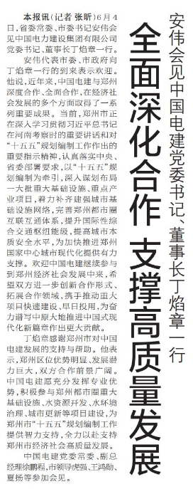 安伟代表市委、市政府向丁焰章一行的到来表示欢迎。他说,近年来,中国电建与郑州深度合作、全面合作,在经济社会发展的多个方面取得了一系列重要成果。当前,郑州市正在深入学习贯彻习近平总书记在河南考察时的重要讲话和对“十五五”规划编制工作作出的重要指示精神,认真落实中央、省委部署要求,以“十五五”规划编制为牵引,深入谋划布局一大批重大基础设施、重点产业项目,着力补齐建强城市基础设施网络,完善郑州都市圈互联互通体系,提升国际性综合交通枢纽能级,提高城市本质安全水平,为加快推进郑州国家中心城市现代化提供有力支撑。欢迎中国电建继续参与到郑州经济社会发展中来,希望双方进一步创新合作形式、拓展合作领域,携手推动重大项目快速建设、早日投用,为奋力谱写中原大地推进中国式现代化新篇章作出更大贡献。(今日《郑州日报》1版)