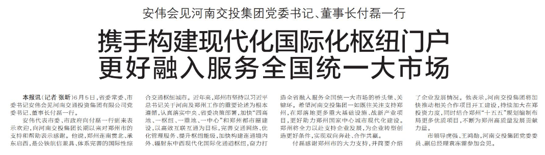安伟代表市委、市政府向付磊一行到来表示欢迎,向河南交投集团长期以来对郑州市的支持和帮助表示感谢。他说,郑州连南贯北、承东启西,是公铁航信兼具、体系完善的国际性综合交通枢纽城市。近年来,郑州市坚持以习近平总书记关于河南及郑州工作的重要论述为根本遵循,认真落实中央、省委决策部署,加快“四高地、一枢纽、一重地、一中心”和郑州都市圈建设,以高效互联互通为目标,完善交通网络、优化管理服务、提升枢纽能级,加快构建连通境内外、辐射东中西现代化国际化通道枢纽,奋力打造全省融入服务全国统一大市场的桥头堡、关键环。希望河南交投集团一如既往关注支持郑州,在郑落地更多重大基础设施、战新产业项目,更好助力郑州国家中心城市现代化建设。郑州将全力以赴支持企业发展,为企业转型创造更好条件,实现双向奔赴、合作共赢。(今日《郑州日报》1版)