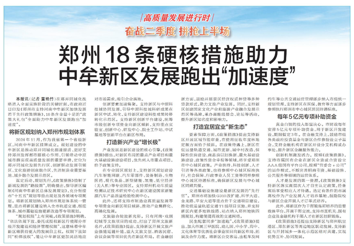 在郑开同城化战略进入全面实施阶段的关键时刻,市政府近日印发《郑州市支持河南中牟新区加快发展若干先行政策措施》,18条含金量十足的“政策大礼包”全面助力中牟新区发展跑出“加速度”。(今日《郑州日报》2版)