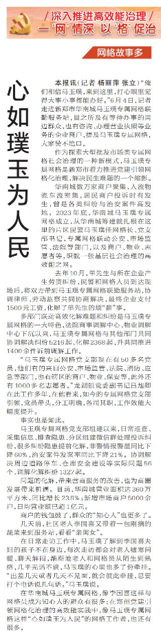 “俺们相信马玉璞,来到这里,打心眼里觉得大事小事都能办好。”6月4日,记者走进新郑市华南城马玉璞专属网格联勤服务站,目之所及有等待办事的周边群众,也有咨询、办理营业执照等业务的企业商户,提及马玉璞专属网格,大家赞不绝口。(今日《郑州日报》2版)