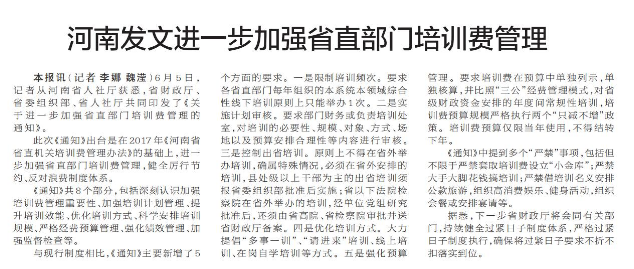 河南发文进一步加强省直部门培训费管理