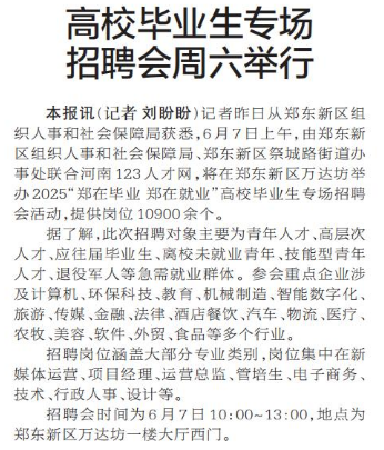 记者昨日从郑东新区组织人事和社会保障局获悉,6月7日上午,由郑东新区组织人事和社会保障局、郑东新区祭城路街道办事处联合河南123人才网,将在郑东新区万达坊举办2025“郑在毕业 郑在就业”高校毕业生专场招聘会活动,提供岗位10900余个。(今日《郑州日报》2版)