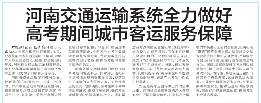 2025年高考即将拉开帷幕。5日,记者从河南省交通运输厅了解到,为给广大考生营造安全、便捷、舒适的出行环境,河南省交通运输系统积极行动,全方位部署高考期间城市客运服务保障工作,助力学子们顺利奔赴考场。(今日《郑州日报》5版)