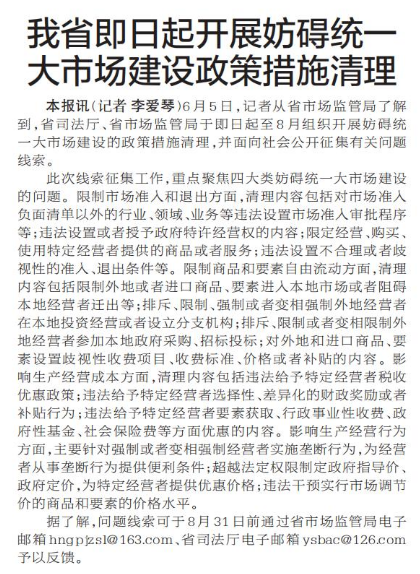 6月5日,记者从省市场监管局了解到,省司法厅、省市场监管局于即日起至8月组织开展妨碍统一大市场建设的政策措施清理,并面向社会公开征集有关问题线索。(今日《郑州日报》6版)
