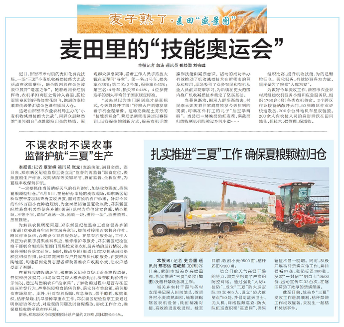 麦浪滚滚,满目金黄。连日来,郑东新区纪检监察工委立足“监督的再监督”职责定位,聚焦夏粮生产作业、收购储存等关键环节,靠前监督、全程监督,为夏粮丰收保驾护航。(今日《郑州日报》7版)