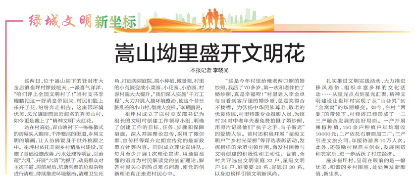 这两日,位于嵩山脚下的登封市大金店镇崔坪村锣鼓喧天,一派喜气洋洋,“咱们评上全国文明村了!”当村支书李耀鹏把这一好消息带回来,村民们脸上乐开了花,纷纷奔走相告。这座因环境优美、风光旖旎而远近闻名的秀美山村,如今更是戴上了“精神文明”大红花。(今日《郑州日报》7版)