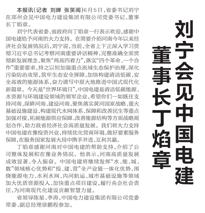 6月5日,省委书记刘宁在郑州会见中国电力建设集团有限公司党委书记、董事长丁焰章。(今日《河南日报》1版)