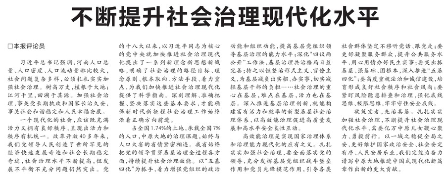 习近平总书记强调,河南人口总量、人口密度、人口流动量都比较大,社会问题复杂多样,必须扎扎实实加强社会治理。树高万丈,植根于大地;江河千里,回溯于其源。加强社会治理,事关党长期执政和国家长治久安,事关社会和谐稳定和人民幸福安康。(今日《河南日报》1版)