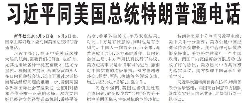 6月5日晚,国家主席习近平应约同美国总统特朗普通电话。(今日《人民日报》1版)