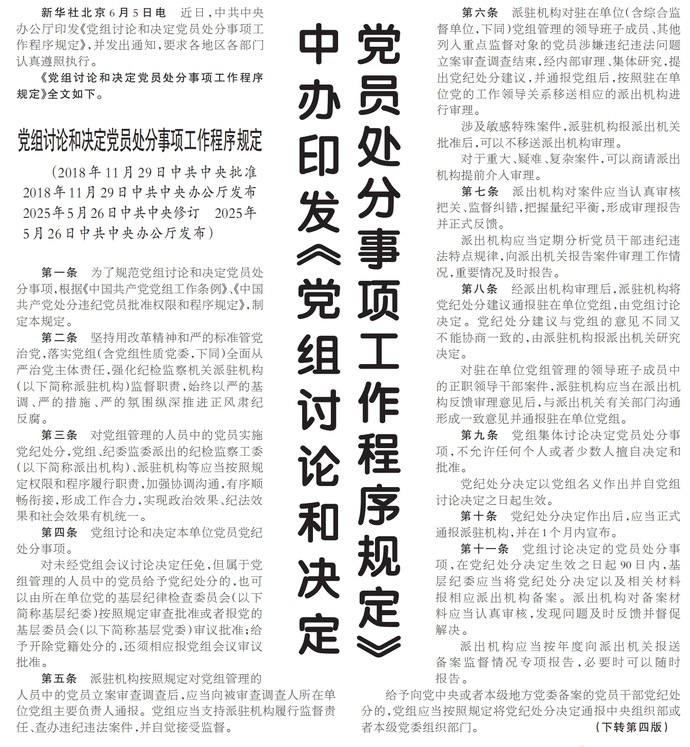 近日,中共中央办公厅印发《党组讨论和决定党员处分事项工作程序规定》,并发出通知,要求各地区各部门认真遵照执行。(今日《人民日报》1版、4版)