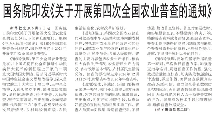 国务院日前印发《关于开展第四次全国农业普查的通知》(以下简称《通知》)。根据《中华人民共和国统计法》和《全国农业普查条例》规定,国务院决定于2026年开展第四次全国农业普查。(今日《人民日报》1版、2版)