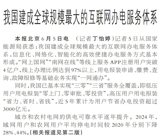 记者5日从国家能源局获悉:我国建成全球规模最大的互联网办电服务体系,信息化、网络化、智能化的高效便捷办电服务方式基本形成。“网上国网”“南网在线”等线上服务APP注册用户突破4亿户,线上办理比例达到97%以上,用电报装申请、缴费、查询、故障报修等基础业务实现“一网通办”。(今日《人民日报》1版、2版)