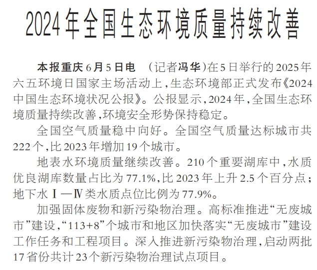在5日举行的2025年六五环境日国家主场活动上,生态环境部正式发布《2024中国生态环境状况公报》。公报显示,2024年,全国生态环境质量持续改善,环境安全形势保持稳定。(今日《人民日报》1版)