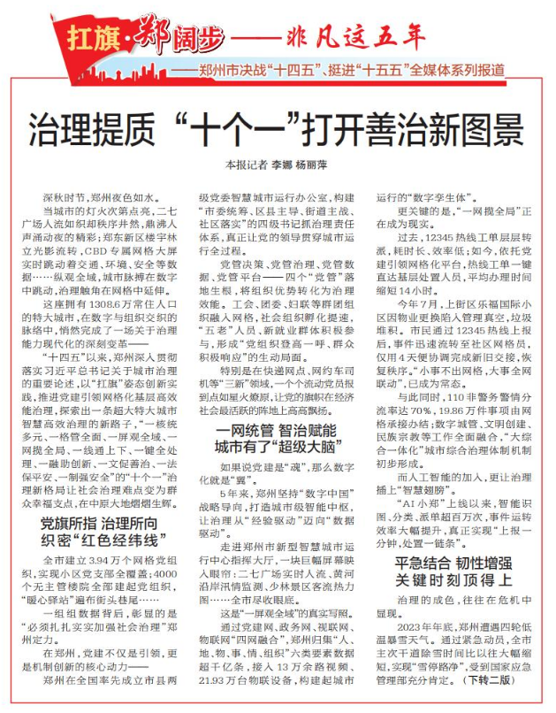 当城市的灯火次第点亮,二七广场人流如织却秩序井然,鼎沸人声涌动夜的精彩;郑东新区楼宇林立光影流转,CBD专属网格大屏实时跳动着交通、环境、安全等数据……纵观全域,城市脉搏在数字中跳动,治理触角在网格中延伸。(今日《郑州日报》1版、2版)