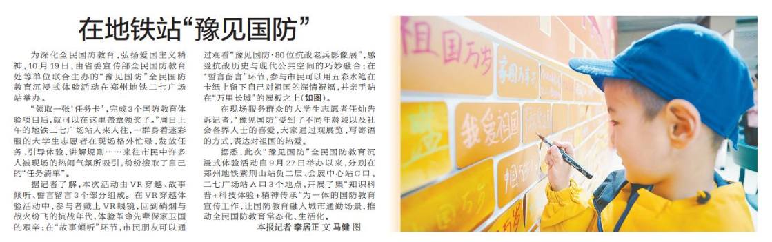 为深化全民国防教育,弘扬爱国主义精神,10月19日,由省委宣传部全民国防教育处等单位联合主办的“豫见国防”全民国防教育沉浸式体验活动在郑州地铁二七广场站举办。(今日《郑州日报》2版)