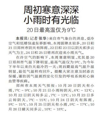 来自市气象台的消息,受冷空气和低槽快速东移影响,本周弱降水较多,20日和21日郑州市阴天有阵雨,22日和23日以阴天和多云天气为主,24日和25日将再次迎来小雨天气。(今日《郑州日报》2版)