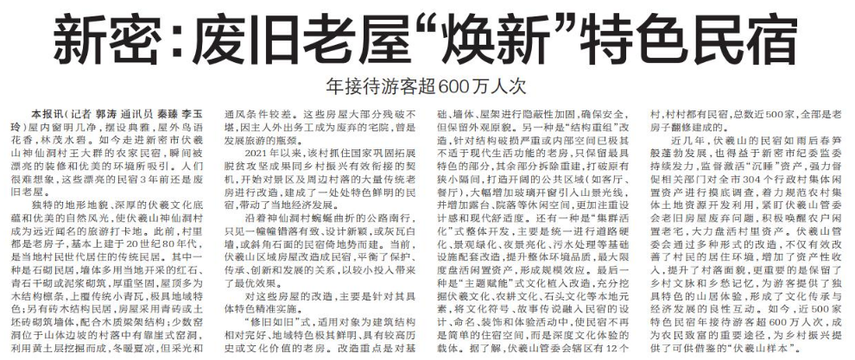 屋内窗明几净,摆设典雅,屋外鸟语花香,林茂水碧。如今走进新密市伏羲山神仙洞村王大群的农家民宿,瞬间被漂亮的装修和优美的环境所吸引。人们很难想象,这些漂亮的民宿3年前还是废旧老屋。(今日《郑州日报》5版)