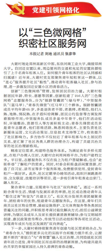 大谢村地处郑州高新区中部,东依河南工业大学,南接郑州大学。自回迁安置以来,周边便利的交通和充足的安置房源吸引了上千名青年租客入住。如何提升青年租客的社区认同感和归属感?近年来,大谢村党支部聚焦青年短租客这一群体,以“连心”服务提升社区“黏性”,推动青年租客融入社区、参与治理,进一步激发回迁安置小区的青春活力。(今日《郑州日报》5版)