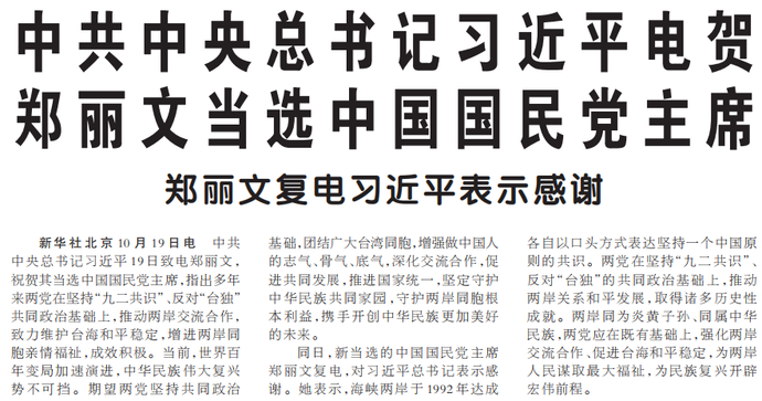 中共中央总书记习近平19日致电郑丽文,祝贺其当选中国国民党主席,指出多年来两党在坚持“九二共识”、反对“台独”共同政治基础上,推动两岸交流合作,致力维护台海和平稳定,增进两岸同胞亲情福祉,成效积极。当前,世界百年变局加速演进,中华民族伟大复兴势不可挡。期望两党坚持共同政治基础,团结广大台湾同胞,增强做中国人的志气、骨气、底气,深化交流合作,促进共同发展,推进国家统一,坚定守护中华民族共同家园,守护两岸同胞根本利益,携手开创中华民族更加美好的未来。(今日《人民日报》1版)