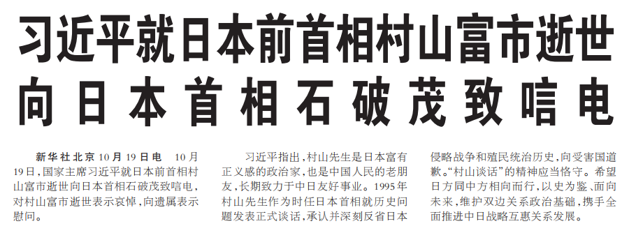 10月19日,国家主席习近平就日本前首相村山富市逝世向日本首相石破茂致唁电,对村山富市逝世表示哀悼,向遗属表示慰问。(今日《人民日报》1版)
