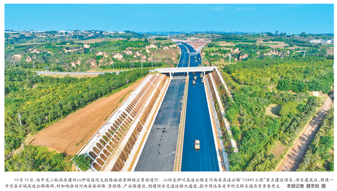 10月15日,由中交二航局承建的沁伊高速巩义段路面沥青摊铺正紧张进行。沁阳至伊川高速公路是河南省高速公路“13445工程”重点建设项目,项目建成后,将进一步完善区域高速公路路网,对加快推动河南省旅游路、资源路、产业路建设,构建综合交通运输大通道,提升周边各省市的互联互通具有重要意义。(今日《河南日报》1版)