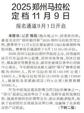 跑天地之中,回老家河南。备受关注的“郑州银行杯”2025郑州马拉松官宣定档,赛事将于11月9日在郑东新区CBD如意湖畔鸣枪开跑。赛事报名通道将于9月1日10:00开启。(今日《郑州日报》1版、2版)