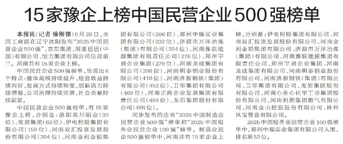 15家豫企上榜中国民营企业500强榜单