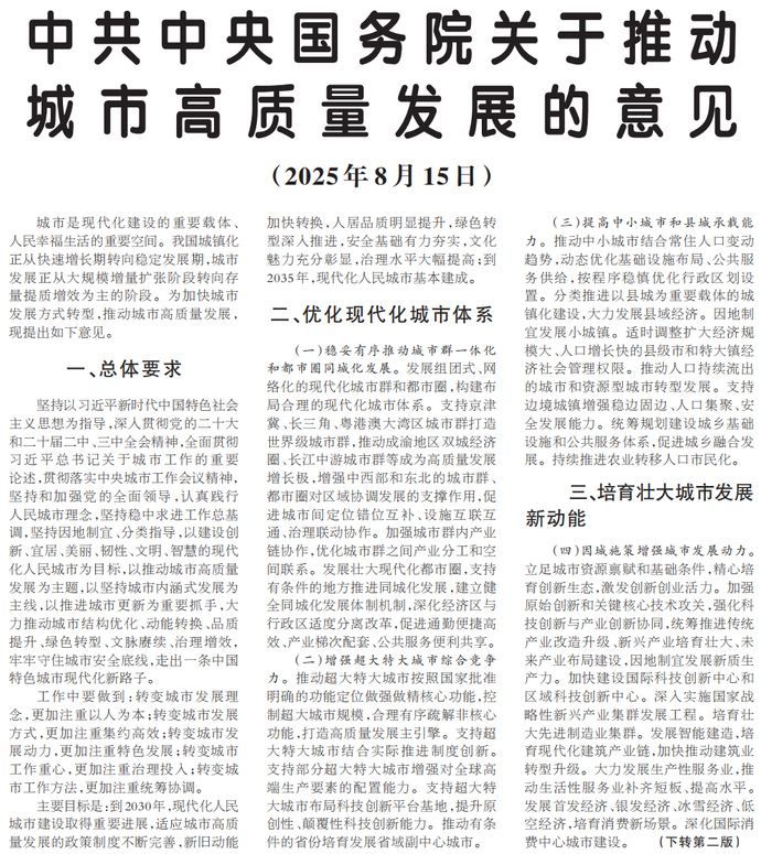 城市是现代化建设的重要载体、人民幸福生活的重要空间。我国城镇化正从快速增长期转向稳定发展期,城市发展正从大规模增量扩张阶段转向存量提质增效为主的阶段。为加快城市发展方式转型,推动城市高质量发展,现提出如下意见。(今日《人民日报》1版、2版)