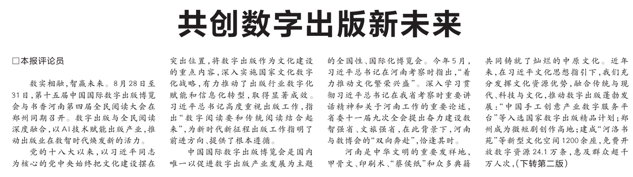 数实相融,智赢未来。8月28日至31日,第十五届中国国际数字出版博览会与书香河南第四届全民阅读大会在郑州同期召开。数字出版与全民阅读深度融合,以AI技术赋能出版产业,推动出版业在数智时代焕发新的活力。(今日《河南日报》1版、2版)
