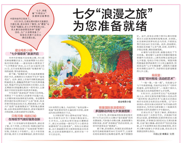 8月28日,记者从郑州部分文旅景区、主题乐园、商业街区了解到,当“暑假”与“周末”相叠加,在七夕佳节到来之际,各大景区纷纷策划各种“甜蜜”活动,为广大游客准备了一场场仪式感十足的沉浸式浪漫之旅。(今日《郑州日报》8版)