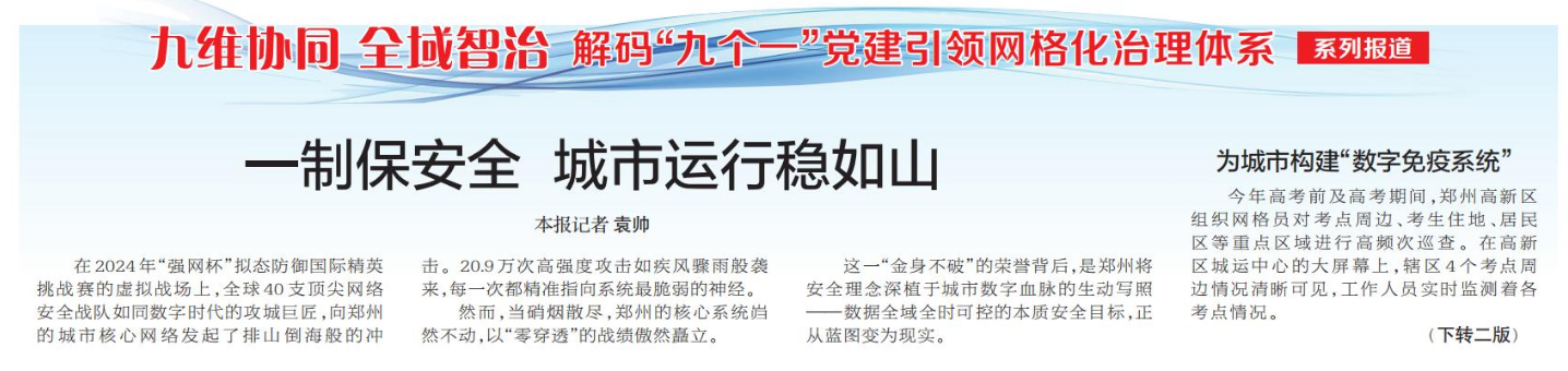 在2024年“强网杯”拟态防御国际精英挑战赛的虚拟战场上,全球40支顶尖网络安全战队如同数字时代的攻城巨匠,向郑州的城市核心网络发起了排山倒海般的冲击。20.9万次高强度攻击如疾风骤雨般袭来,每一次都精准指向系统最脆弱的神经。(今日《郑州日报》1版、2版)
